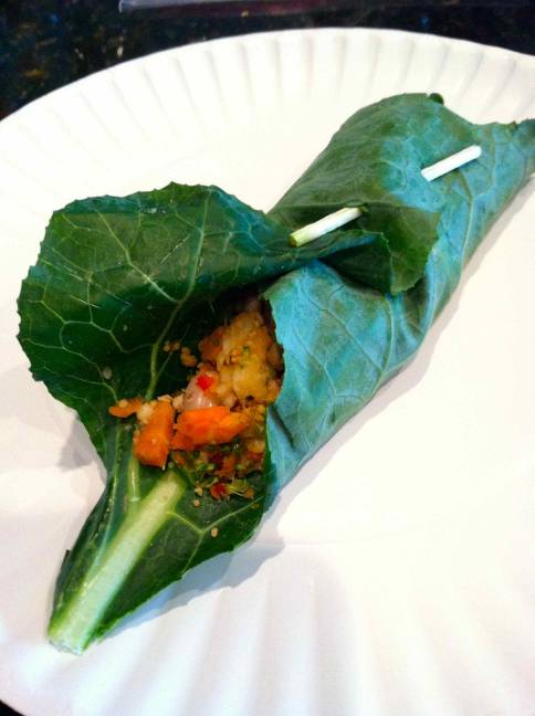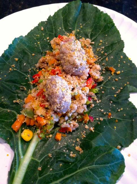 A beautiful Collard leaf, her vegis, grains and cereals, gnocchi sprinkled with ground pellet. Wrapped up for her Gracefulness! She was quite intrigued!