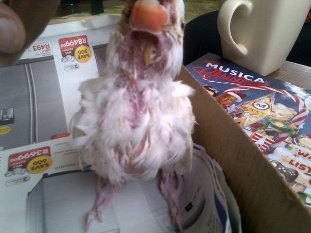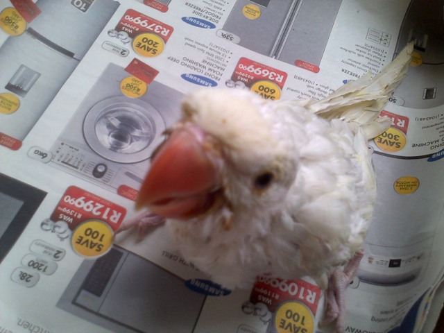 @AlphaWolf - Hand feeding him baby formula at the moment. 3 - 4 feeds a day of 3 x 5ml syringes. Feeding him something called AVIPLUS Phase 2 - 2 weeks to ± 6 weeks. Thanks for the input Wolf.