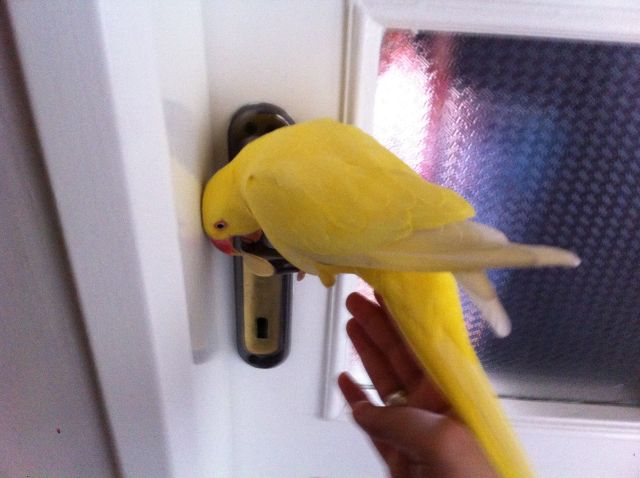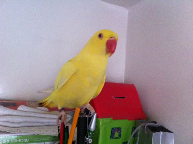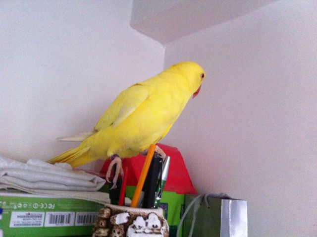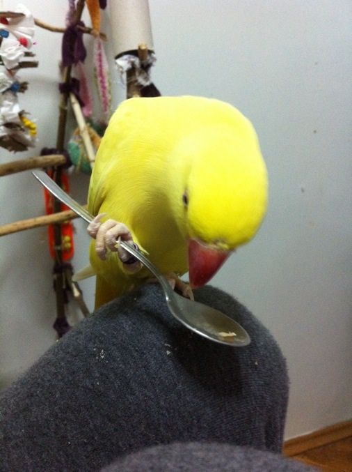 When I go to the pantry to get treats, Sapphire flies over and holds her mouth open to tell me she wants one.