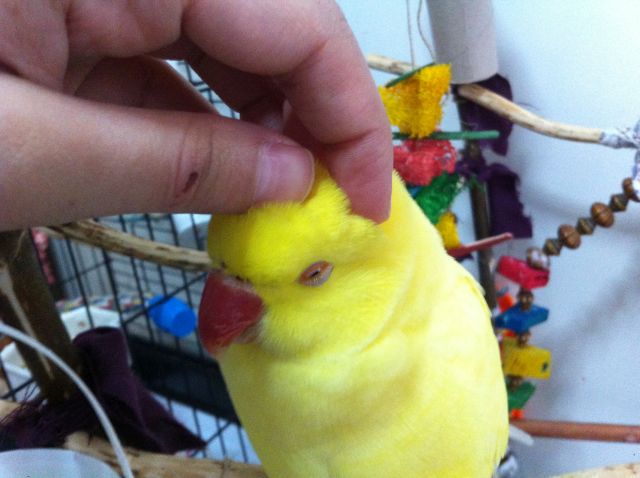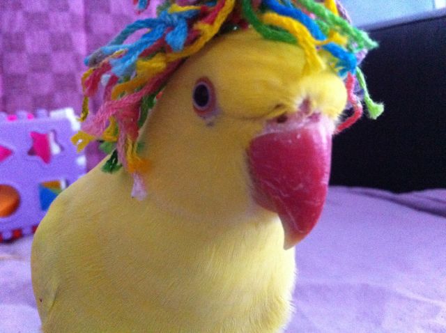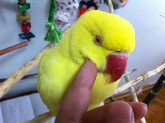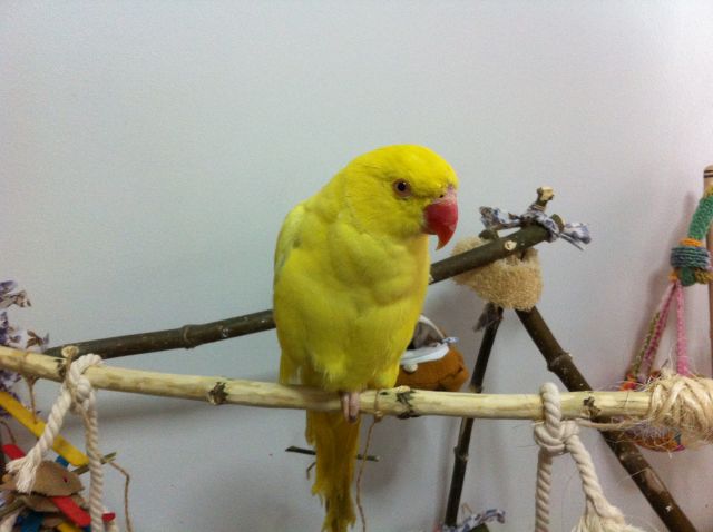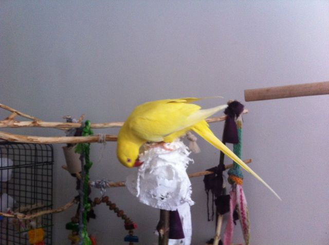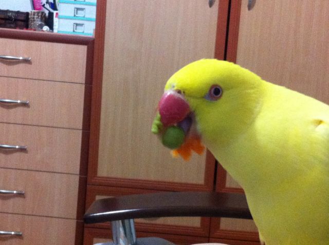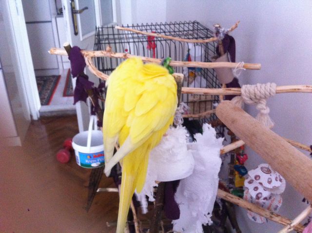 Hi everyone. I have a lovely lutino IRN. My bird's name is Börek. When I owned her/him, s/he was almost one year old. Börek is not wild Bird. S/he has foot bracelet but Börek came from another country. I'm Börek's second owner. When Börek came to me, Her/him condition was so bad. Phsically and mentally. In Turkey, parrot owners are so ignorant about their birds. Börek's first owner made many mistakes. He forced my baby to do things . He has two african greys and one of them bite my baby's foot. ( I stalk him on internet.=) ) So, this is Börek's story. We have been together 6 months. Now Börek is so good . I dont know Börek's gender yet. It's my first big parrot so I need your help. Sorry for my poor english =)