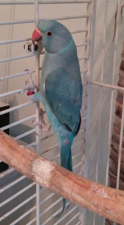 Here is the offspring of the black-beaked blue hen and a violet male. Maternal Grandfather was the blue male pictured. this baby was 2014s hatch - unsexed so far, but I believe may be male. Is an odd color - not blue, not turquoise (parblue), not violet.