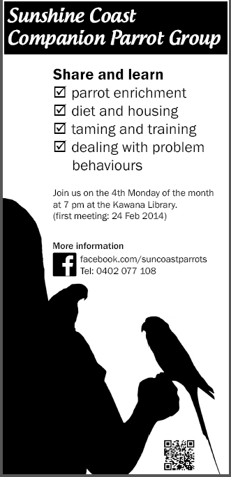 Claire in the Air and I are launching a face-to-face companion parrot group on the Sunshine Coast, Queensland, Australia. Information below.