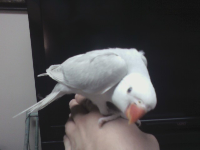 She is about 3 months old now and growing like a weed. Her favorite treats are dehydrated yellow squash cut into circles. I shower her with love and she has been responding very well... but tends to be moody and very much an introvert... which is fine with us. She likes her family here... the birdies and tiny poodle. She chats all day long with her friends: 2 parrotlets, 2 green cheek conures, and 2 cockatiels.